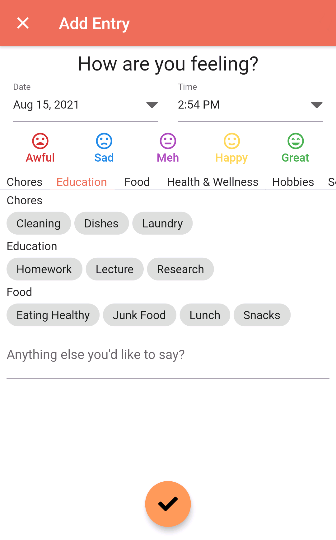 Pick your mood and labels. Not feeling a mood, or want to expand? You can create or edit existing moods to better track you feelings. Even change their icons to better express how you're feeling.
